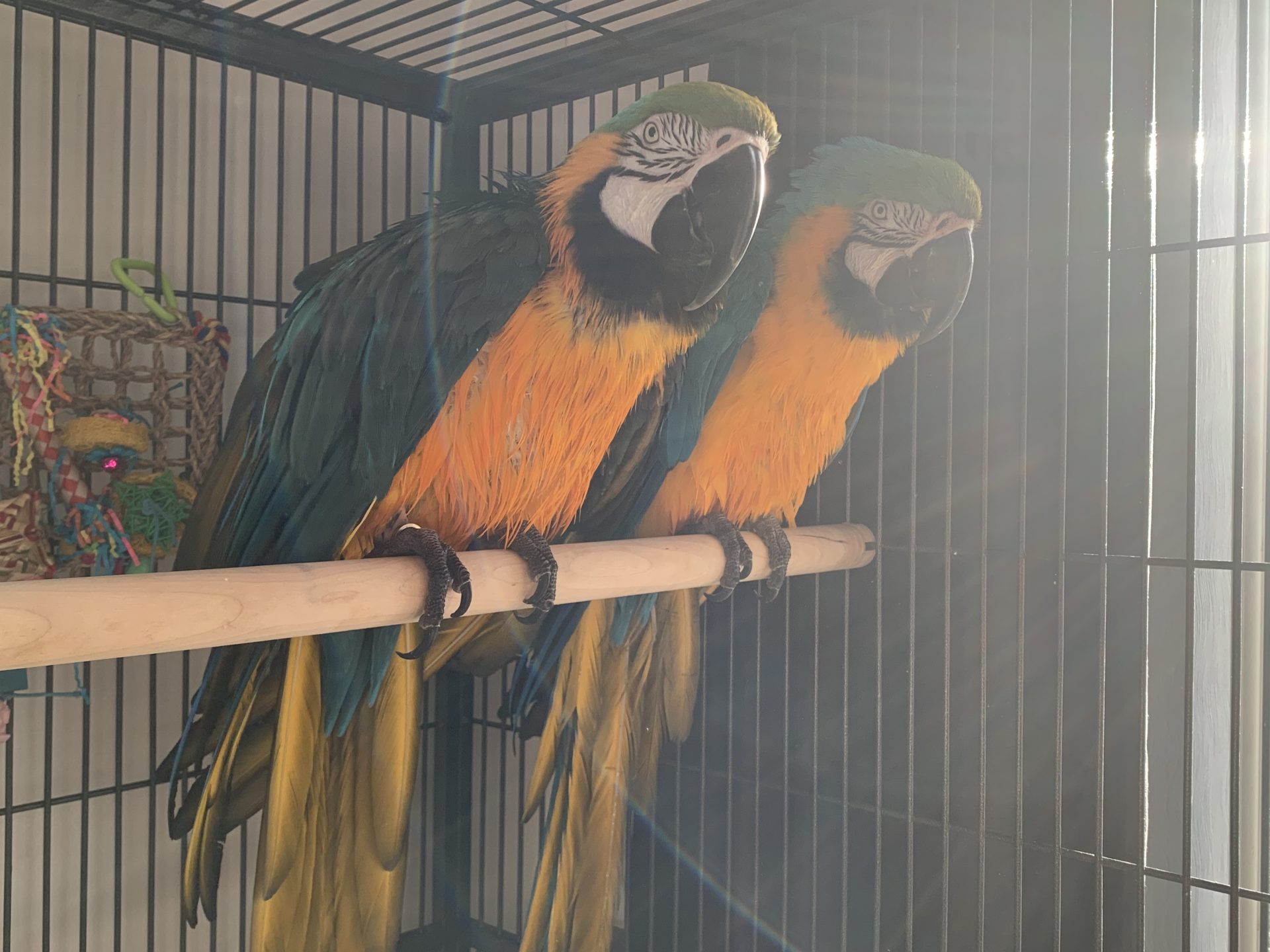 Bailey and Ozzie are a bonded Pair of B&G Macaws. Ozzie is approximately 30 years old and Bailey is 13 years old. As far as we know they have been together for the last 13 years.