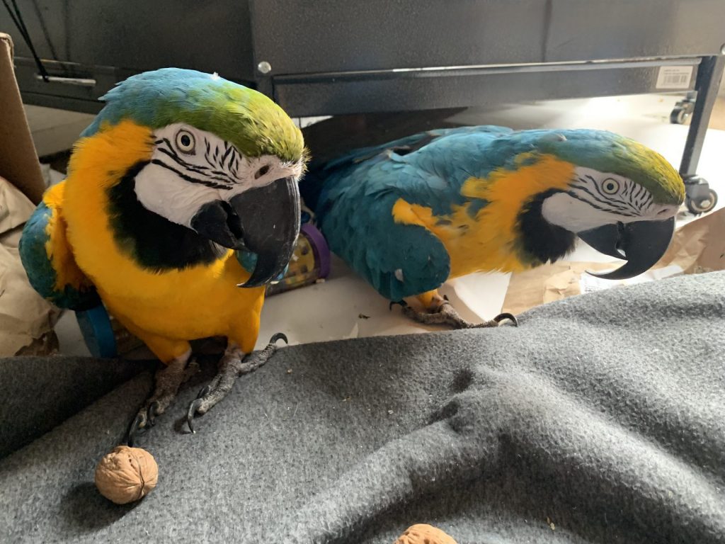 I believe with a lot of TLC and patience they will come along in leaps and bounds. Bailey especially as he is a lot more responsive and willing to learn and interact with you. They need a home with a firm, confident owner, who is used to big birds. These guys are not tame, cuddly birds, Ozzie especially will bite if you get too close. But they are happy doing their own thing. They are used to being out of the cage all day, sitting together and watching the world go by, or waddling round the floor, chewing cardboard, following each other like little ducks. They do everything together! Oz does like to run and chase feet though. So watch your toes!
