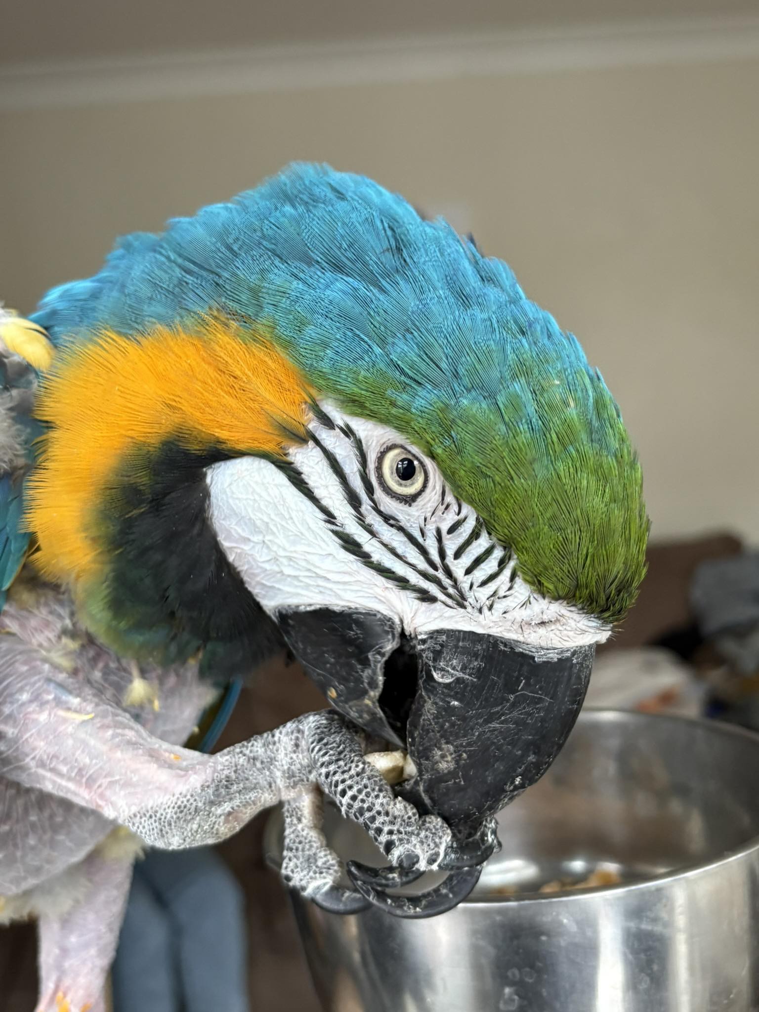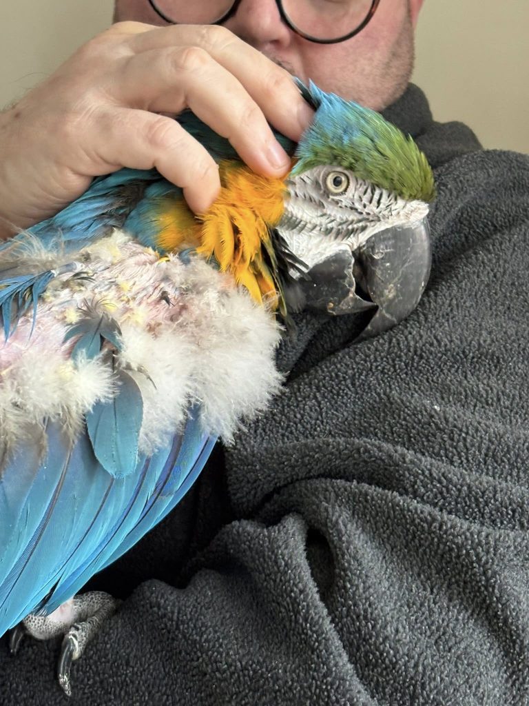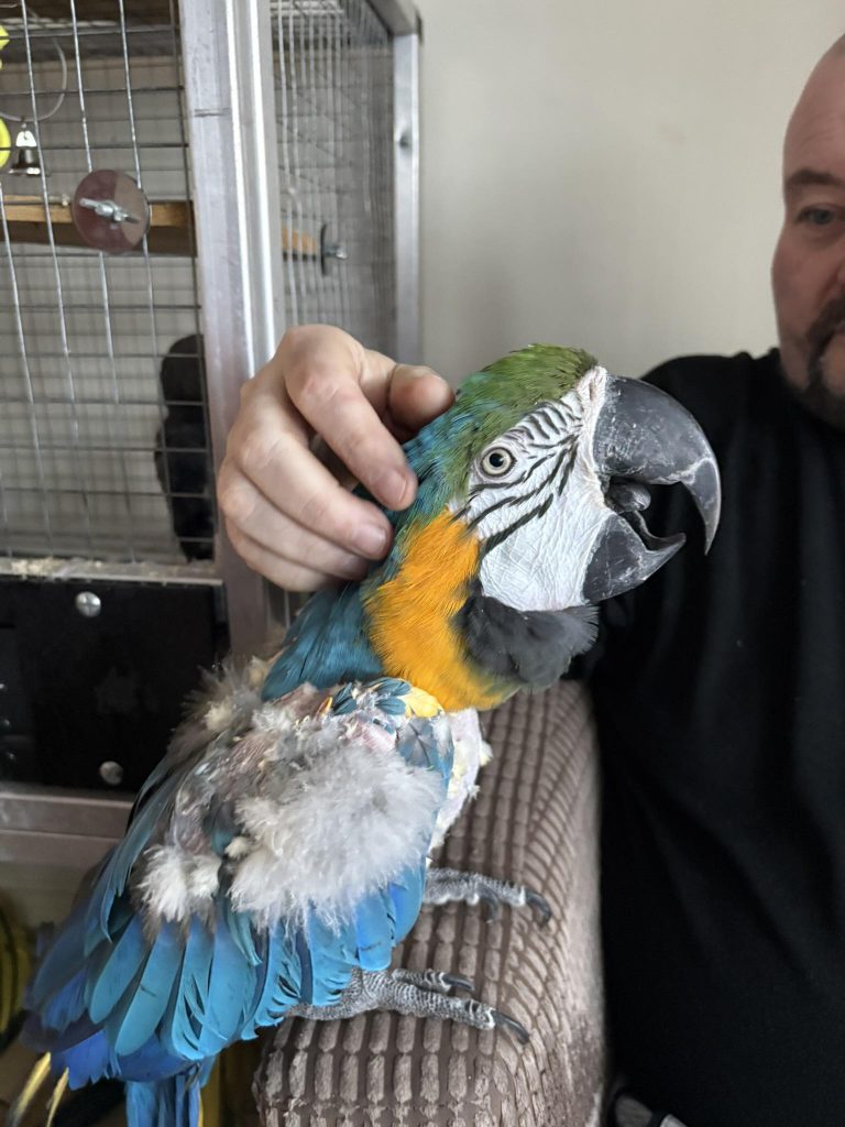 He can be very loud at times, he is a macaw after all, but if you’re his favourite person he’ll probably sit with you all day with no problems.